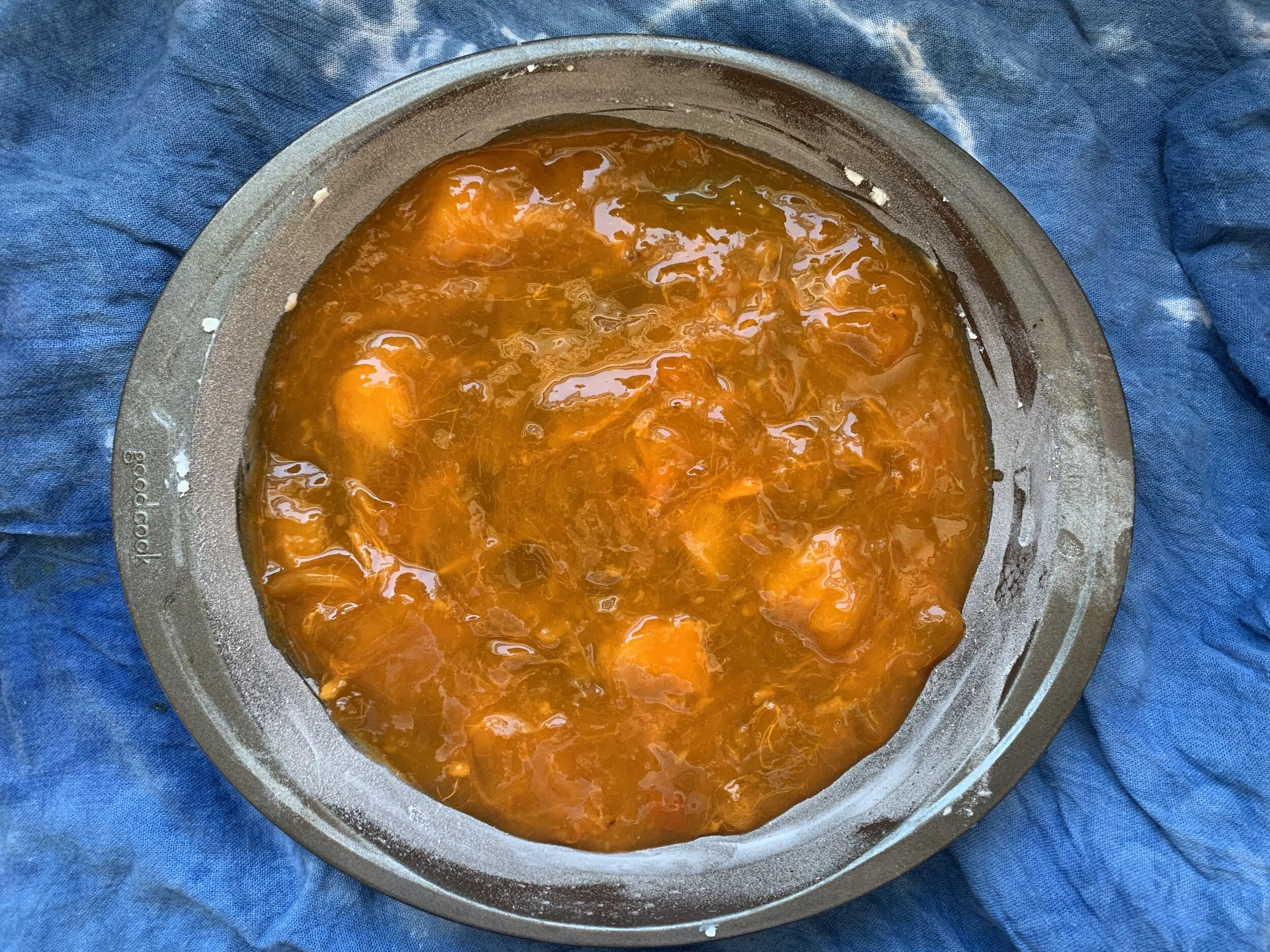 Add oat crumble to the pan on top of the persimmon mix. Distribute the crumble evenly across the top